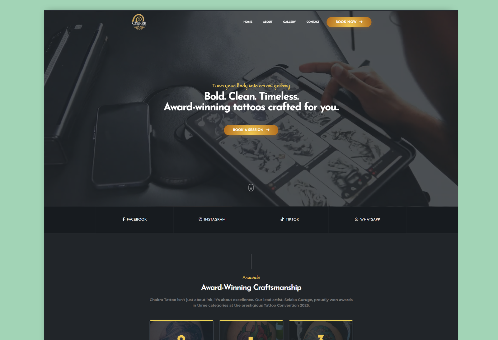This project enabled us to transform Chakra Tattoo’s artistic identity into a powerful online presence. The final website not only showcases the artist’s talent but also elevates the brand helping them attract new clients, build trust, and stand out in the competitive tattoo industry.This project enabled us to transform Chakra Tattoo’s artistic identity into a powerful online presence. The final website not only showcases the artist’s talent but also elevates the brand, helping them attract new clients, build trust, and stand out in the competitive tattoo industry.